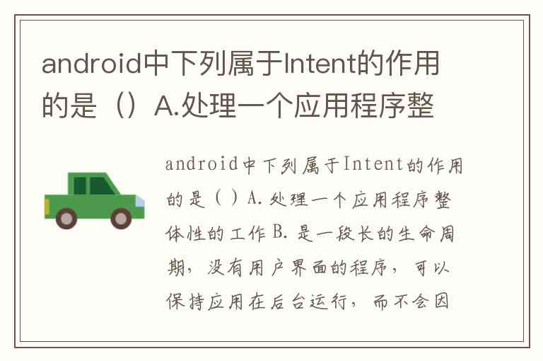 android中下列属于Intent的作用的是()A.处理一个应用程序整体性的工作 B.是一段长的生命周期,没有用户界面的程序,可以保持应用在后台运行,而不会因为切换页面而消失 C.实现应用程序间的数据共享 D.可以实现界面间的切换,可以包含动作和动作数据,连接四大组件的纽带