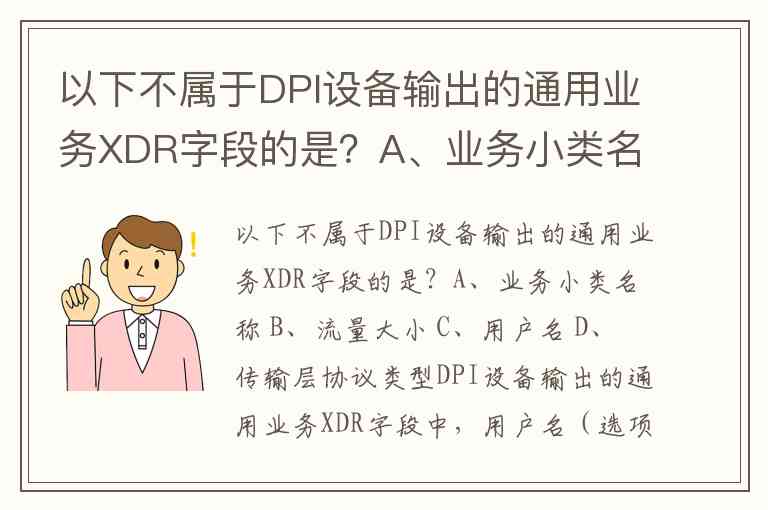 以下不属于DPI设备输出的通用业务XDR字段的是?A、业务小类名称 B、流量大小 C、用户名 D、传输层协议类型