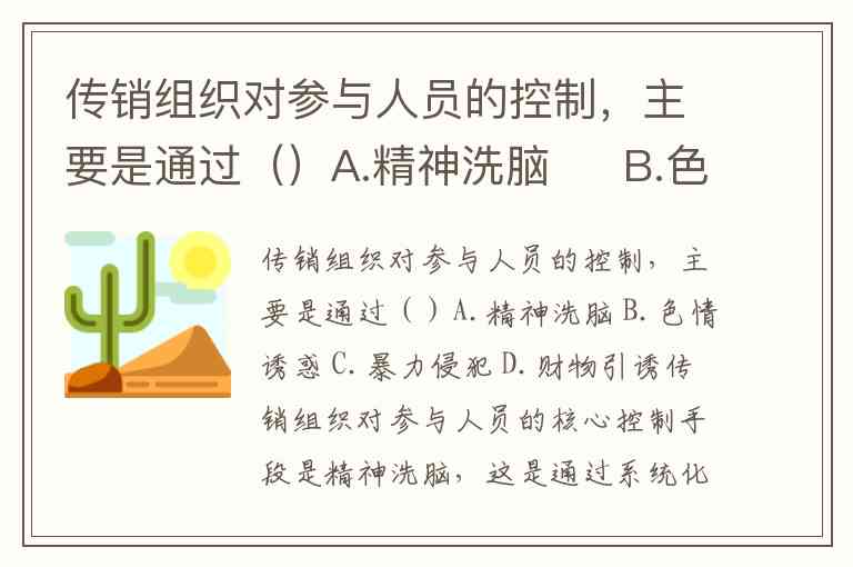 传销组织对参与人员的控制,主要是通过()A.精神洗脑 B.色情诱惑 C.暴力侵犯 D.财物引诱