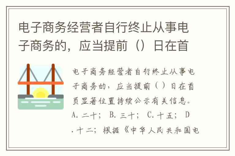 电子商务经营者自行终止从事电子商务的,应当提前()日在首页显著位置持续公示有关信息。A.二十; B.三十; C.十五; D.十二;