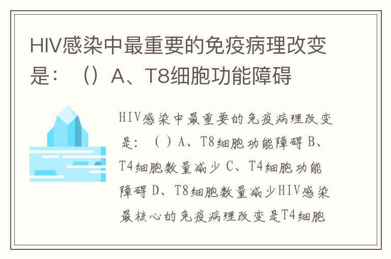 HIV感染中最重要的免疫病理改变是:()A、T8细胞功能障碍 B、T4细胞数量减少 C、T4细胞功能障碍 D、T8细胞数量减少