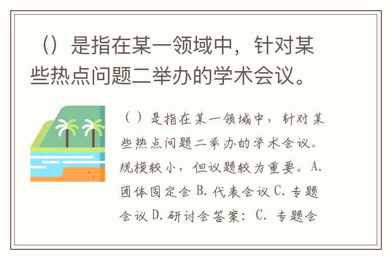 ()是指在某一领域中,针对某些热点问题二举办的学术会议。规模较小,但议题较为重要。A.团体固定会 B.代表会议 C.专题会议 D.研讨会