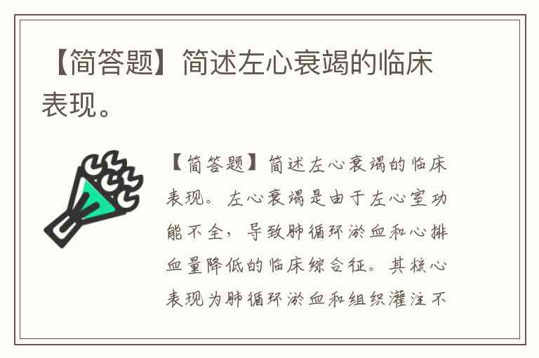 左心衰竭是由于左心室功能不全,导致肺循环淤血和心排血量降低的临床综合征。其核心表现为肺循环淤血和组织灌注不足两大症候群,典型症状与左心射血能力下降、肺静脉压力升高直接相关。