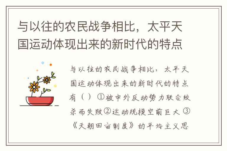 太平天国运动作为中国近代史上规模最大的农民战争,其新时代特点集中体现在反侵略性质和资本主义色彩两大维度。与传统农民战争相比,它首次面临中外反动势力联合镇压,并在纲领层面触及近代化改革方向,这些特征深刻烙印着19世纪中期全球化冲击下的时代印记。