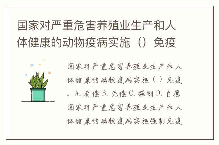 国家对严重危害养殖业生产和人体健康的动物疫病实施()免疫。A.有偿 B.无偿 C.强制 D.自愿