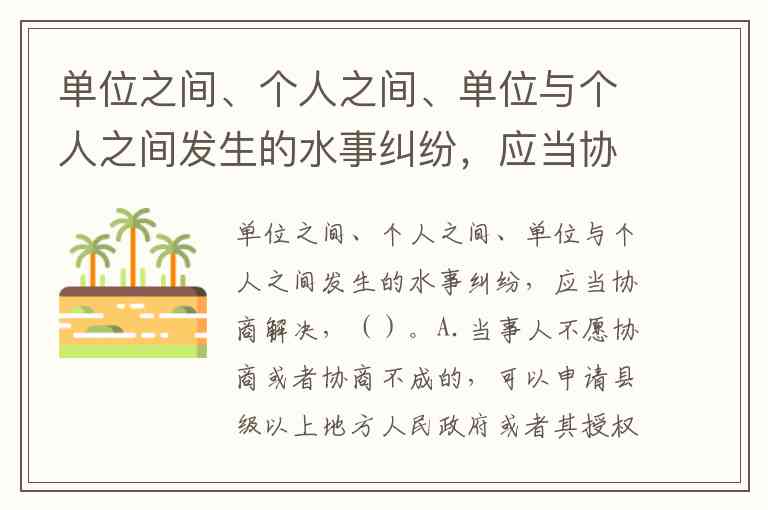 单位之间、个人之间、单位与个人之间发生的水事纠纷,应当协商解决,()。A.当事人不愿协商或者协商不成的,可以申请县级以上地方人民政府或者其授权的部门调解 B.当事人不愿协商或者协商不成的,可以可以直接向人民法院提起民事诉讼 C.县级以上地方人民政府或者其授权的部门调解不成的,当事人可以向人民法院提起民事诉讼 D.在水事纠纷解决前,当事人不得单方面改变现状