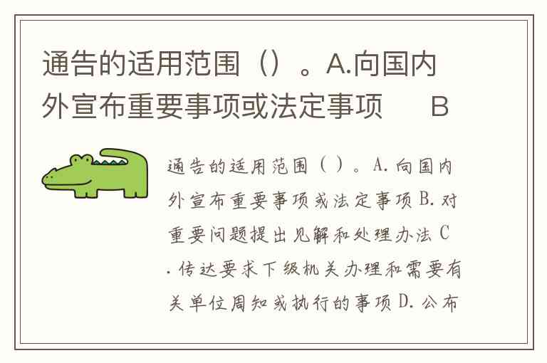 通告的适用范围()。A.向国内外宣布重要事项或法定事项 B.对重要问题提出见解和处理办法 C.传达要求下级机关办理和需要有关单位周知或执行的事项 D.公布有关各方面应当遵守或周知的事项
