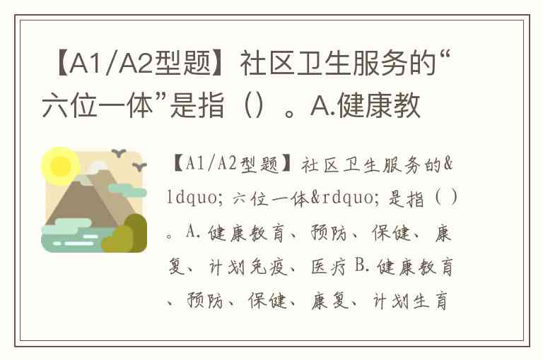 【A1/A2型题】社区卫生服务的“六位一体”是指()。A.健康教育、预防、保健、康复、计划免疫、医疗 B.健康教育、预防、保健、康复、计划生育指导、医疗 C.健康教育、预防、营养、康复、计划生育指导、医疗 D.法制教育、预防、保健、康复、计划生育指导、医疗 E.法制教育、预防、营养、康复、计划生育指导、医疗