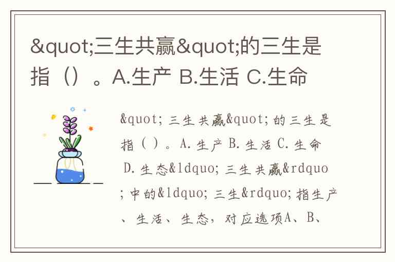 "三生共赢"的三生是指()。A.生产 B.生活 C.生命 D.生态