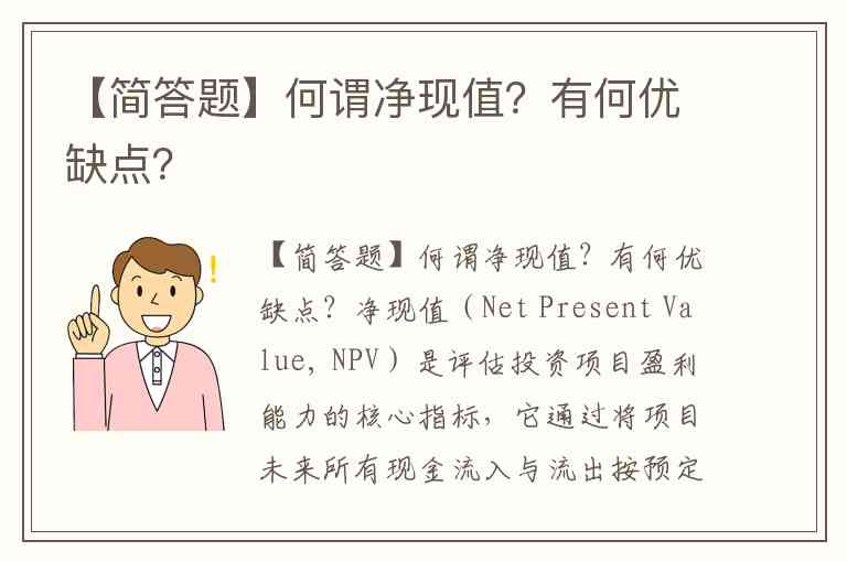 净现值(Net Present Value, NPV)是评估投资项目盈利能力的核心指标,它通过将项目未来所有现金流入与流出按预定折现率折算为当前价值,再计算差额来判断项目是否值得投资。其基本公式为:NPV = 未来现金净流量现值总和 - 初始投资额现值,其中未来现金流量需通过折现因子(为折现率,为时期)转换为当前价值。当NPV≥0时,项目收益满足最低要求,在经济上可行;反之则不可行。