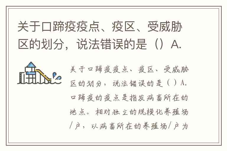 关于口蹄疫疫点、疫区、受威胁区的划分,说法错误的是()A.口蹄疫的疫点是指发病畜所在的地点。相对独立的规模化养殖场/户,以病畜所在的养殖场/户为疫点;散养畜以病畜所在的自然村为疫点;放牧畜以病畜所在的牧场及其活动场地为疫点;病畜在运输过程中发生疫情,以运载病畜的车、船、飞机等为疫点。 B.在市场发生疫情,以病畜所在市场为疫点;在屠宰加工过程中发生疫情,以屠宰加工厂(场)为疫点。 C.口蹄疫疫区是指由疫点边缘向外延伸3公里内的区域。 D.口蹄疫受威胁区是指由疫区边缘向外延伸5公里的区域。