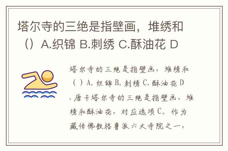 塔尔寺的三绝是指壁画,堆绣和()A.织锦 B.刺绣 C.酥油花 D.唐卡