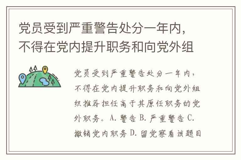 党员受到严重警告处分一年内,不得在党内提升职务和向党外组织推荐担任高于其原任职务的党外职务。A.警告 B.严重警告 C.撤销党内职务 D.留党察看