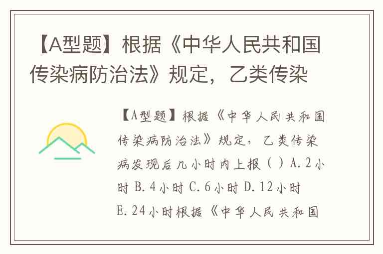 【A型题】根据《中华人民共和国传染病防治法》规定,乙类传染病发现后几小时内上报()A.2小时 B.4小时 C.6小时 D.12小时 E.24小时