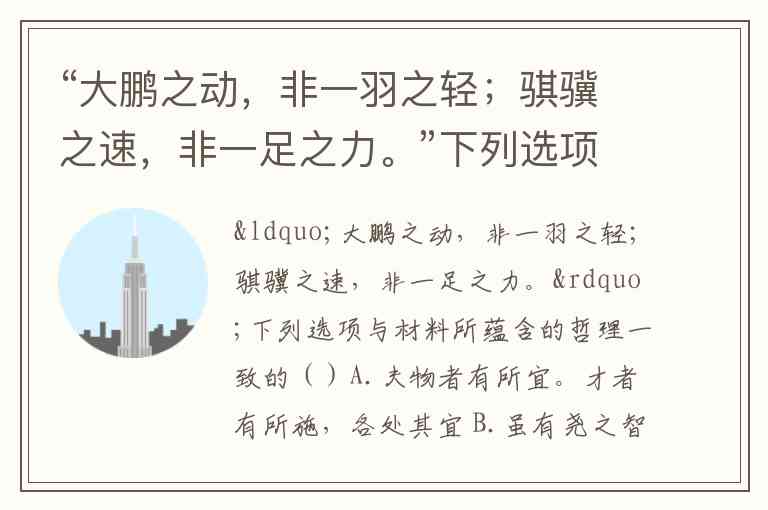 “大鹏之动,非一羽之轻;骐骥之速,非一足之力。”下列选项与材料所蕴含的哲理一致的()A.夫物者有所宜。才者有所施,各处其宜 B.虽有尧之智而无众人之助,大功不立 C.为政以德,譬如北辰,居其所而众星拱之 D.夫君子取情而去貌,好质而恶饰