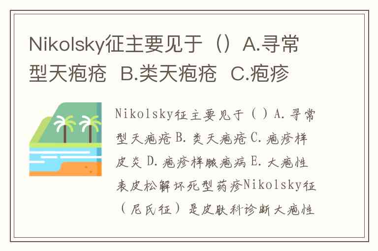 Nikolsky征主要见于()A.寻常型天疱疮 B.类天疱疮 C.疱疹样皮炎 D.疱疹样脓疱病 E.大疱性表皮松解坏死型药疹