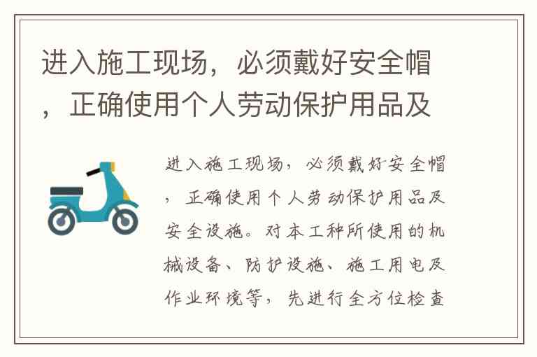 进入施工现场,必须戴好安全帽,正确使用个人劳动保护用品及安全设施。对本工种所使用的机械设备、防护设施、施工用电及作业环境等,先进行全方位检查,确认安全后方可施工,如有问题及时报告。