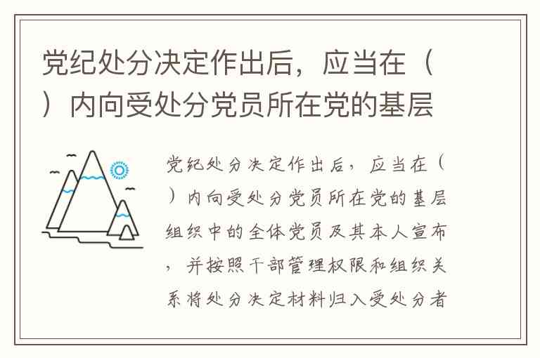 党纪处分决定作出后,应当在一个月内向受处分党员所在党的基层组织中的全体党员及其本人宣布,并按照干部管理权限和组织关系将处分决定材料归入受处分者档案。这一期限规定源于《中国共产党纪律处分条例》第四十四条,旨在确保纪律处分的及时性和严肃性,避免因拖延削弱惩戒效果。