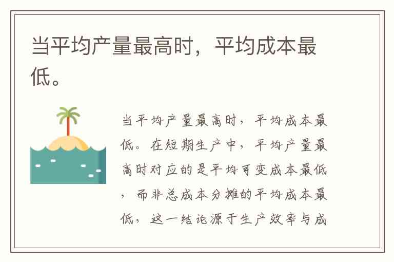 在短期生产中,平均产量最高时对应的是平均可变成本最低,而非总成本分摊的平均成本最低,这一结论源于生产效率与成本结构的深层关联。当企业仅能调整部分生产要素(如劳动力)时,平均产量与平均可变成本呈现严格的反向关系:假设劳动力是唯一可变要素,平均可变成本,其中为工资率,恰好是劳动平均产量的倒数,因此。这意味着当平均产量达到最大值时,其倒数最小,平均可变成本自然降至最低点。