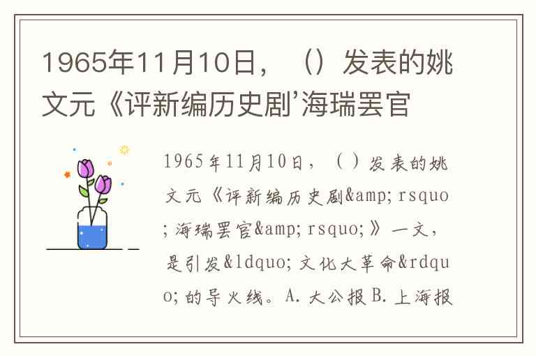 1965年11月10日,()发表的姚文元《评新编历史剧’海瑞罢官’》一文,是引发“文化大革命”的导火线。A.大公报 B.上海报 C.文汇报 D.国闻报