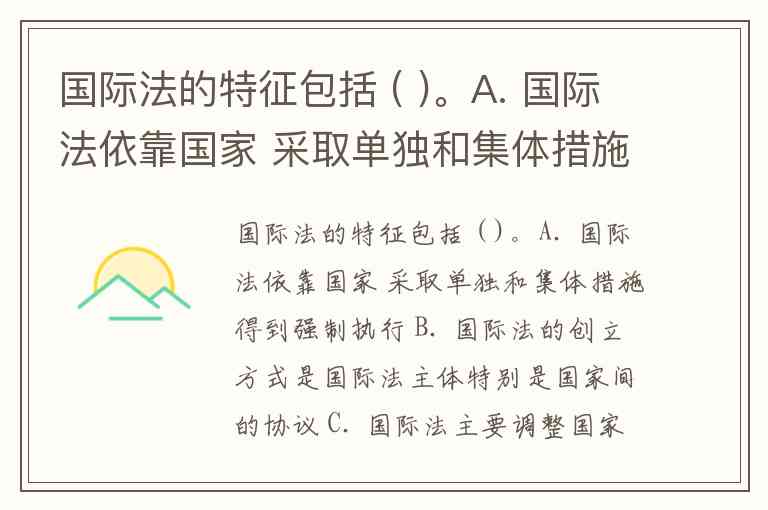 国际法的特征包括 ( )。A. 国际法依靠国家 采取单独和集体措施得到强制执行 B. 国际法的创立方式是国际法主体特别是国家间的协议 C. 国际法主要调整国家之间的法律关系 D. 国际法通过国际法院和安理会得到强制执行