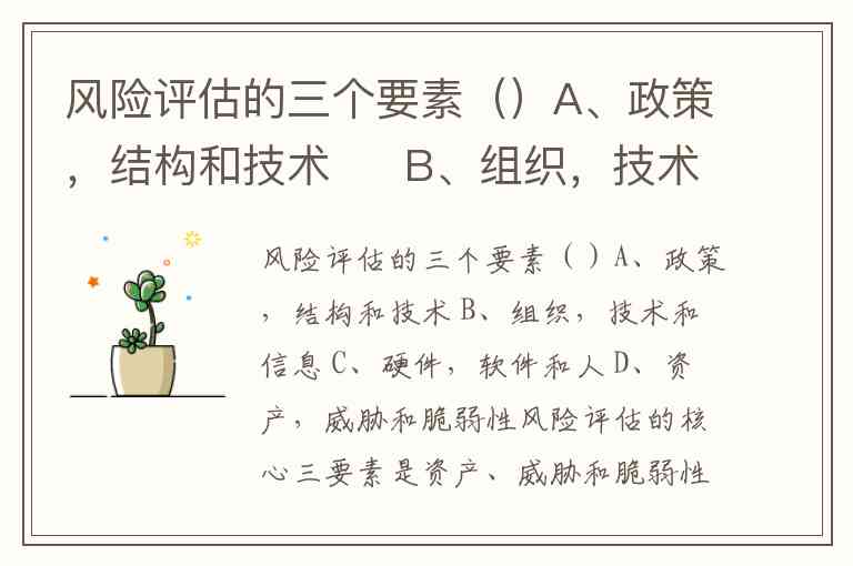 风险评估的三个要素()A、政策,结构和技术 B、组织,技术和信息 C、硬件,软件和人 D、资产,威胁和脆弱性