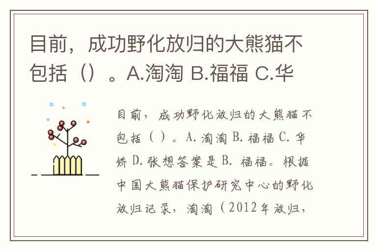 目前,成功野化放归的大熊猫不包括()。A.淘淘 B.福福 C.华娇 D.张想