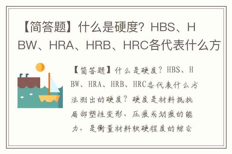 【简答题】什么是硬度?HBS、HBW、HRA、HRB、HRC各代表什么方法测出的硬度?