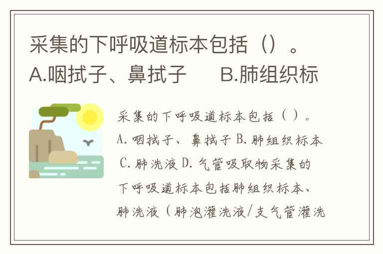 采集的下呼吸道标本包括()。A.咽拭子、鼻拭子 B.肺组织标本 C.肺洗液 D.气管吸取物