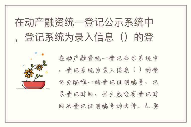 在动产融资统一登记公示系统中,登记系统为录入信息要素齐备、格式符合要求的登记分配唯一的登记证明编号,记录登记时间,并生成含有登记时间及登记证明编号的文件。这一规则明确体现在系统操作规范中,确保登记流程的标准化和有效性。