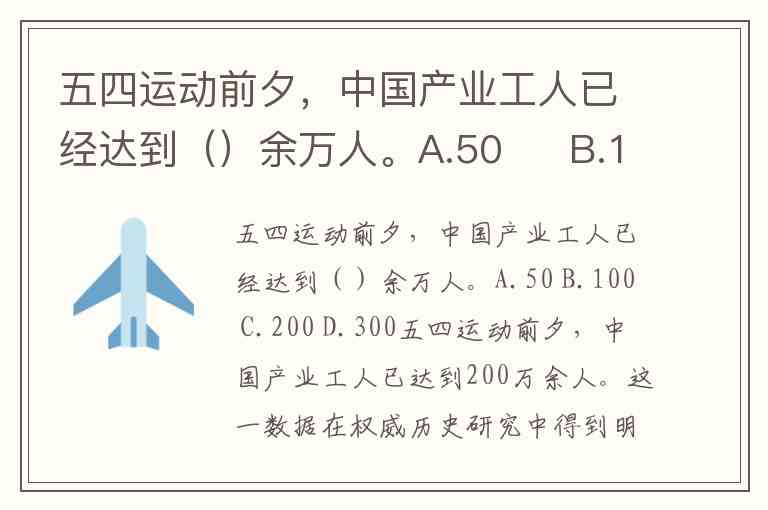 五四运动前夕,中国产业工人已经达到()余万人。A.50 B.100 C.200 D.300