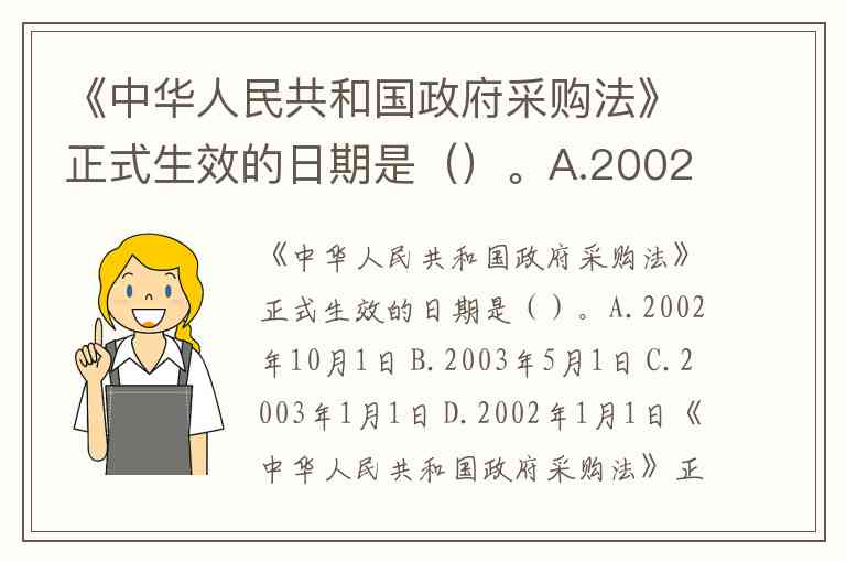 《中华人民共和国政府采购法》正式生效的日期是()。A.2002年10月1日 B.2003年5月1日 C.2003年1月1日 D.2002年1月1日