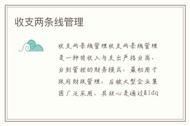 收支两条线管理是一种将收入与支出严格分离、分别管控的财务模式,最初用于政府财政管理,后被大型企业集团广泛采用。其核心是通过“收入集中、支出预算”实现资金高效配置与风险控制,无论是政府机关、事业单位还是企业,本质都是切断收支直接关联,以制度形式规范资金流动全流程。