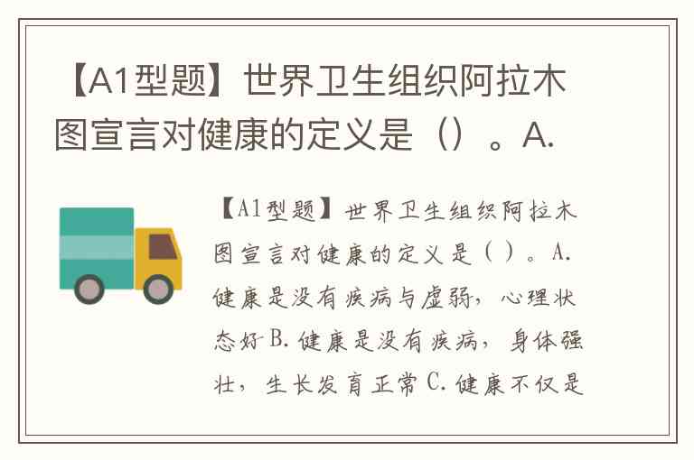 【A1型题】世界卫生组织阿拉木图宣言对健康的定义是()。A.健康是没有疾病与虚弱,心理状态好 B.健康是没有疾病,身体强壮,生长发育正常 C.健康不仅是没有疾病与虚弱,而是身心健康,社会幸福的完美状态 D.健康是身体无疾病 E.健康是生理上健康,心理良好