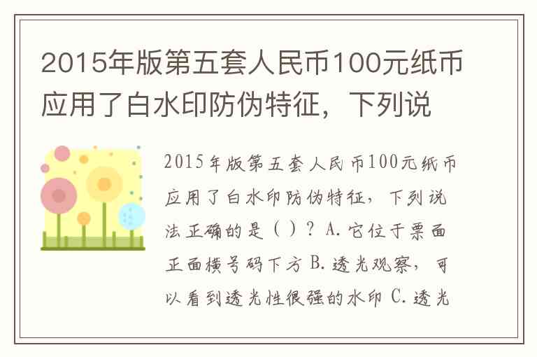 2015年版第五套人民币100元纸币应用了白水印防伪特征,下列说法正确的是()?A.它位于票面正面横号码下方 B.透光观察,可以看到透光性很强的水印 C.透光观察,可见毛泽东头像水印 D.透光观察,可见面额数字100水印