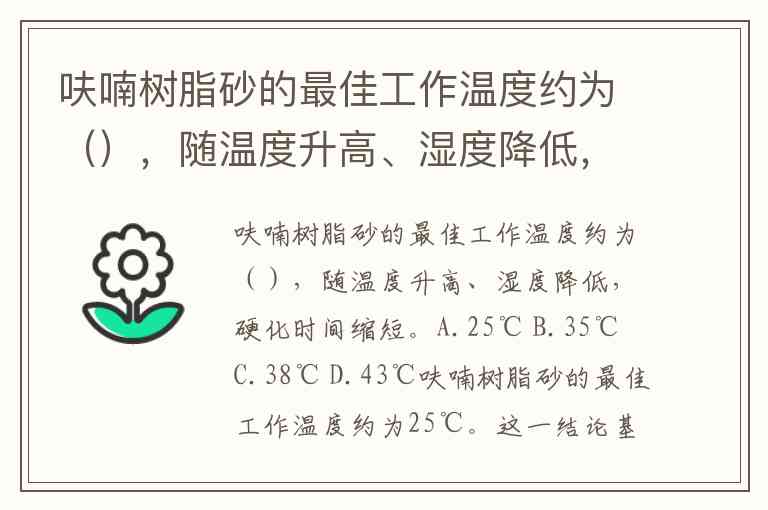 呋喃树脂砂的最佳工作温度约为(),随温度升高、湿度降低,硬化时间缩短。A.25℃ B.35℃ C.38℃ D.43℃