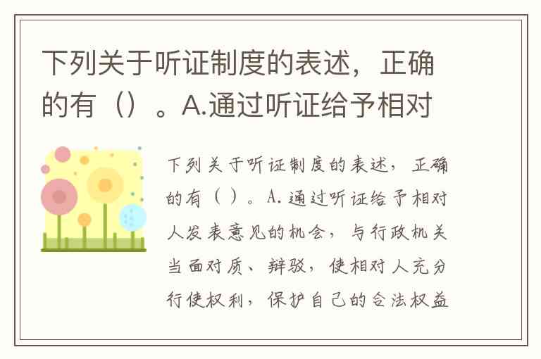 D选项错误,听证制度通常伴随行政成本增加。程序设计中的听证准备、多方参与、笔录制作等环节会消耗更多时间与资源,其核心价值在于公正而非效率。尽管部分案例显示听证可通过前期沟通减少后续争议,但这属于间接效益,并非制度的直接目标。