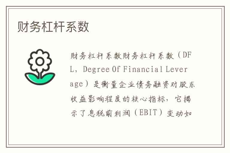 财务杠杆系数(DFL,Degree Of Financial Leverage)是衡量企业债务融资对股东收益影响程度的核心指标,它揭示了息税前利润(EBIT)变动如何放大每股收益(EPS)的波动幅度。简单来说,当企业存在固定利息支出时,EBIT的微小变化会通过财务杠杆效应被放大为EPS的更大变化,这种"以小博大"的机制既是潜在收益的来源,也是财务风险的导火索。