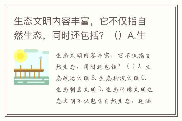 生态文明内容丰富,它不仅指自然生态,同时还包括?()A.生态政治文明 B.生态科技文明 C.生态制度文明 D.生态环境文明