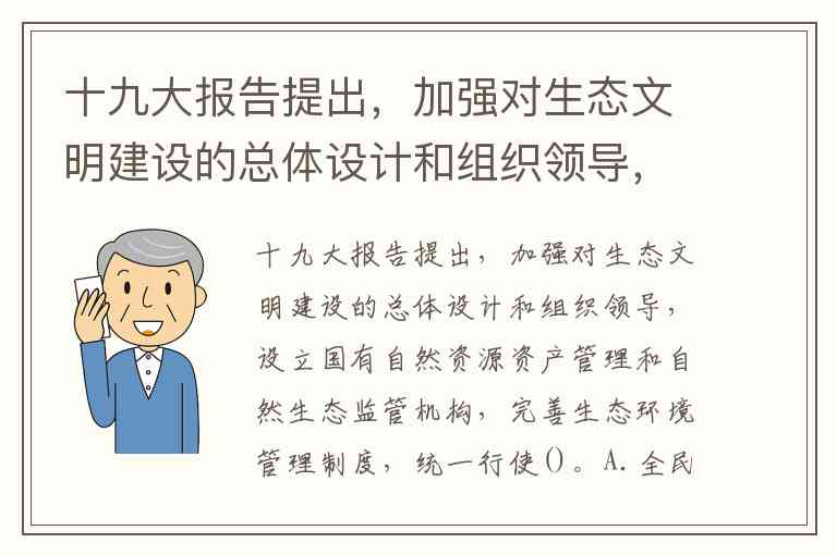 十九大报告提出,加强对生态文明建设的总体设计和组织领导,设立国有自然资源资产管理和自然生态监管机构,完善生态环境管理制度,统一行使()。A.全民所有自然资源资产所有者职责 B.所有国土空间用途管制职责 C.所有国土空间生态保护修复职责 D.监管城乡各类污染排放和行政执法职责