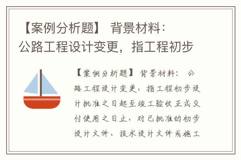 【案例分析题】 背景材料: 公路工程设计变更,指工程初步设计批准之日起至竣工验收正式交付使用之日止,对已批准的初步设计文件、技术设计文件或施工图设计文件所进行的修改,完善等活动。为加强公路工程建设管理,规范公路工程设计变更行为,保证公路工程质量,保护人民生命及财产安全,《公路工程设计变更管理办法》要求各级交通主管部门应当加强对公路工程设计变更活动的监督管理,明确了不同类型公路工程设计变更的具体要求。 (1)何谓公路工程设计变更?公路工程设计变更分为几类? (2)公路工程设计变更中哪些属于重大设计变更?