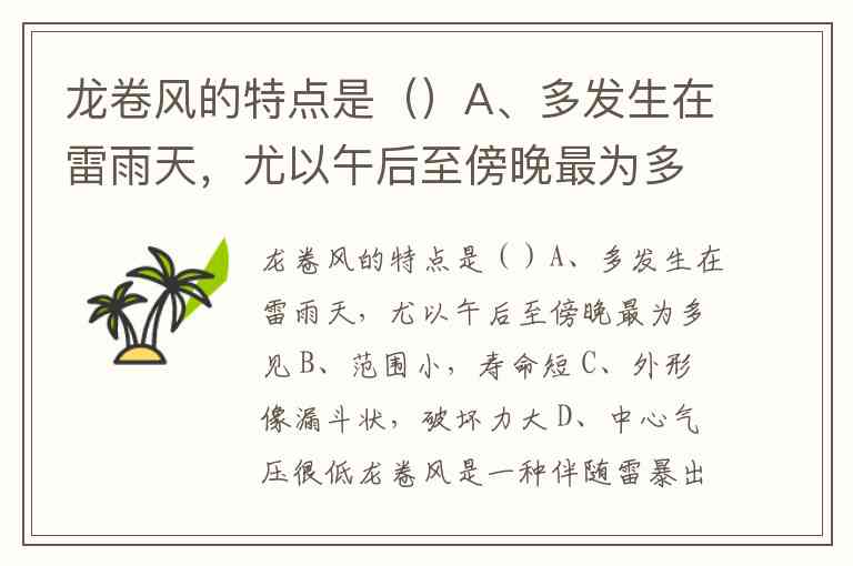 龙卷风的特点是()A、多发生在雷雨天,尤以午后至傍晚最为多见 B、范围小,寿命短 C、外形像漏斗状,破坏力大 D、中心气压很低