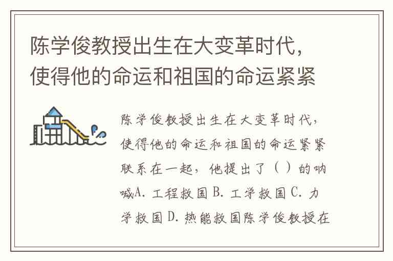 陈学俊教授出生在大变革时代,使得他的命运和祖国的命运紧紧联系在一起,他提出了()的呐喊A.工程救国 B.工学救国 C.力学救国 D.热能救国