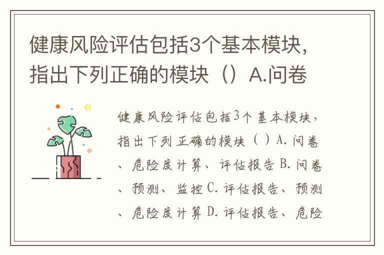 健康风险评估包括3个基本模块,指出下列正确的模块()A.问卷、危险度计算、评估报告 B.问卷、预测、监控 C.评估报告、预测、危险度计算 D.评估报告、危险度计算、预测 E.问卷、管理、预测