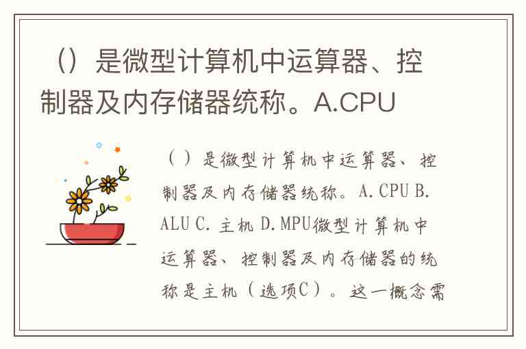 ()是微型计算机中运算器、控制器及内存储器统称。A.CPU B.ALU C.主机 D.MPU