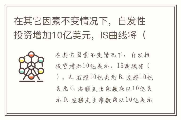 在其它因素不变情况下,自发性投资增加10亿美元,IS曲线将()。A.右移10亿美元 B.左移10亿美元 C.右移支出乘数乘以10亿美元 D.左移支出乘数乘以10亿美元