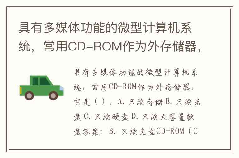 具有多媒体功能的微型计算机系统,常用CD-ROM作为外存储器,它是()。A.只读存储 B.只读光盘 C.只读硬盘 D.只读大容量软盘