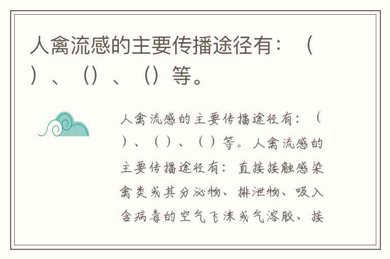 人禽流感的主要传播途径有:直接接触感染禽类或其分泌物、排泄物、吸入含病毒的空气飞沫或气溶胶、接触被病毒污染的环境表面等。