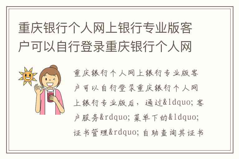 重庆银行个人网上银行专业版客户可以自行登录重庆银行个人网上银行专业版后,通过“客户服务”菜单下的“证书管理”自助查询其证书状况。