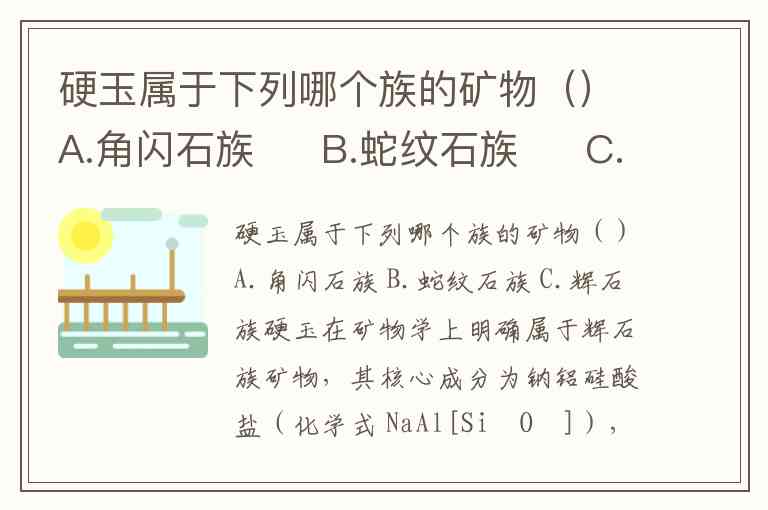 这一分类不仅是学术定义,也影响实际应用——硬玉的代表性品种翡翠 正因辉石族矿物的特性,成为兼具硬度与韧性的名贵宝石。而选项中的角闪石族(如透闪石软玉)和蛇纹石族(如岫玉),其成分与结构均与硬玉截然不同,因此正确答案为 C.辉石族。